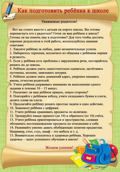 Развивайте память: учите детские стишки, песенки, учите отгадывать загадки, рассказывайте сказки по - очереди: вы начинаете, а малыш продолжает, снова вы подхватываете, а он продолжает, придумайте новое продолжение сказки. Рассказывайте сказку, театрализуя её: используйте куклу, приготовьте костюм, распределите роли, меняйте голос по характеру героя. Если ребёнок ходил в детский сад, то наверняка у него там есть друзья, он уже умеет вести себя в коллективе, знает, что есть определённые правила, которые необходимо соблюдать. Поговорите с ребёнком о школе. Ему нужно также общаться с детьми, учителем, у него будет много новых друзей, научите его, как спросить о чем – либо или попросить о помощи у сверстников или учителя. Договоритесь, что всё, что сказал учитель – это важно и необходимо выполнять, даже, если ему что – то не нравится. Уже в июле начинайте приучать ребёнка к новому режиму дня: просыпаться чуть раньше, чем обычно (не секрет, что летом многие дети спят чуть не до обеда), чтобы с первого сентября ранний подъем не стал настоящим бедствием для малыша, ложиться спать в определённое время. Кроме того, обратите внимание на то, как малыш одевается, умеет ли сам надевать обувь, ходить в туалет, кушать, вести себя за столом. Удачи Вам, уважаемые ученики и родители!