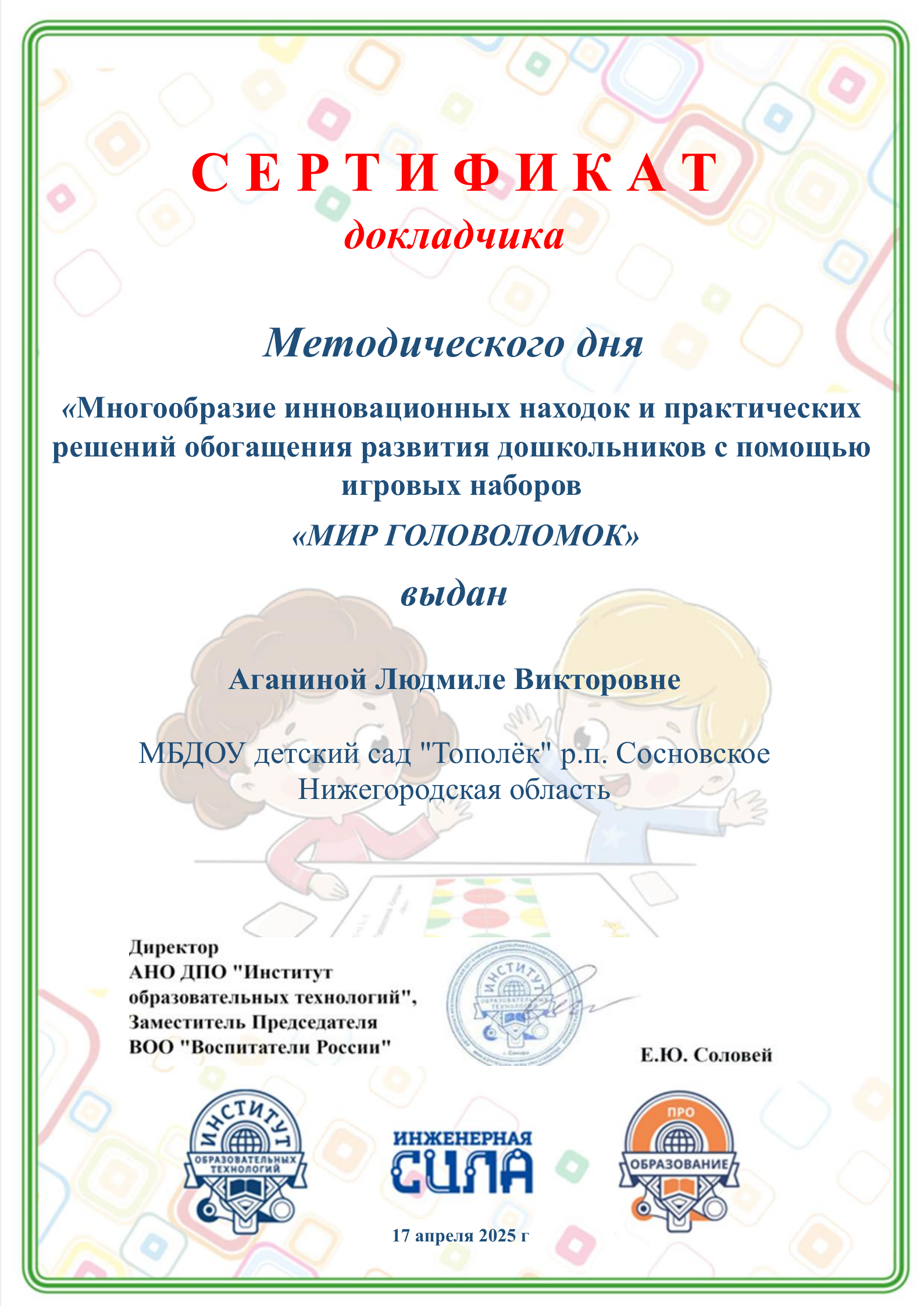 В рамках деятельности инновационной площадки федерального уровня по направлению «МИР ГОЛОВОЛОМОК» апреле 2025 года я принимала участие в «Методическом дне», который предполагает обмен опытом по работе с головоломками.